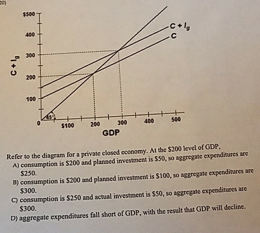 20) $500 T 400 300 200 100 5 S100 200 300 400 500 GDP Refer to the diagram for a private closed economy. At the $200 level of GDP A) consumption is $200 and planned investment is $50, so aggregate expenditures are B) consumption is $200 and planned investment is $100, so aggregate expenditures are C) consumption is $250 and actual investment is $50, so aggregate expenditures are D) aggregate ...