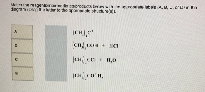 Chemistry questions and answers. The following energy diagram depicts a reaction where an alcohol is converted to an alkyl halide. Match the reagents/intermediates/products below with the appropriate labels (A, B, C, or D) in the diagram (Drag the letter to the appropriate structure (s)). The following energy diagram depicts a reaction where an alcohol is converted to an alkyl halide. x-axis is the reaction coordinate and Y-axis is energy (enthalpy). (20 points) (CH3)3COH +HCI (CH3)3CCI H2O (CH3)3COH2 () Is the overall reaction endothermic or exothermic?