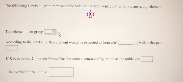 The following Lewis diagram represents the valence electron configuration of a main-group element 'X= This element is in group According to the octet rule, ...4 answers · Top answer: this question is exactly similar to the previous one, the Valence Electron. Let us consider ...