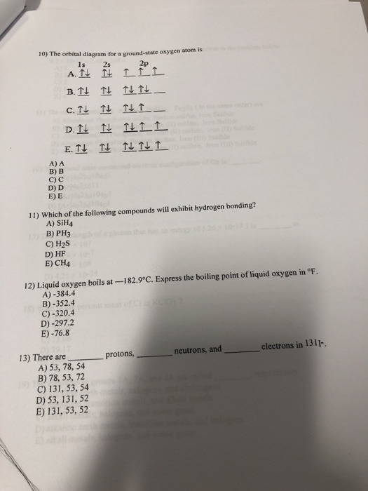 Now, remember, ground state just means the normal electron configuration. So if you look at a periodic table, we'd say that oxygen is right here. We're gonna ... Chemistry. Chemistry questions and answers. 10) The orbital diagram for a ground-state oxygen atom is 1s 2s 2p D.I I L11 A) A B) B C) C D) D E) E 11) Which of the following compounds will exhibit hydrogen bonding? A) SiH4 B) PH3 C) H2S D) HF E) CH4 12) Liquid oxygen boils at -182.9°C. Express the boiling point of liquid oxygen in °F. 15 Sep 2016 — The electron configuration for oxygen is: 1s^2 2s^2 2p^4 This video will walk you through the step of writing orbital diagram.1 answer · http://www.thestudentroom.co.uk/showthread.php?t=3933809&page=30 Explanation: The electron configuration for oxygen is: 1s22s22p4 This video will ... The orbital diagram for a ground state oxygen atom is. C has two unpaired electrons in its ground state. So as you may know in the p subshell there are 3 orbitals x y z that can hold 2 electrons each. The orbital diagram for a ground state oxygen atom is a a b b c c d d e e which element has the following ground state electron configuration.