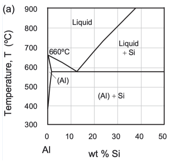 Al-Si alloys differ from our "standard" phase diagram in that aluminium has zero solid solubility in silicon at any temperature. This means that there is no beta phase and so this phase is "replaced" by pure silicon (you can think of it as a beta phase which consists only of silicon).. So, for Al-Si alloys, the eutectic composition is a structure of alpha+Si rather than alpha+beta. Download scientific diagram | Al-Si binary phase diagram [20]. from publication: A criterion to find crack-resistant aluminium alloys to avoid ... The Al-Si Phase Diagram The binary Al-Si phase diagram was initially studied by Fraenkel of Germany in 1908. It is a relatively simple binary diagram where there is very little solubility at room temperature for Si in Al and for Al in Si. Thus, the terminal solid solutions are nearly pure Al and Si under equilibrium conditions.