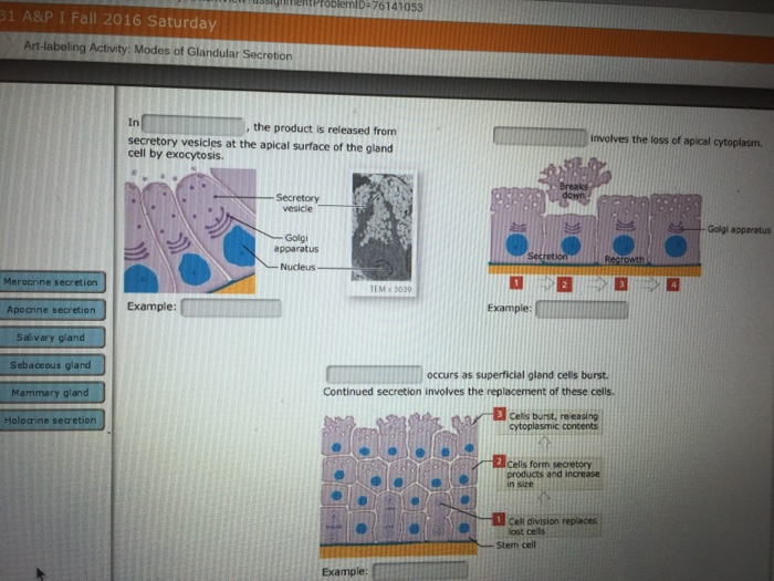 Drag the labels onto the diagram to identify the modes of glandular secretion.. Involves loss of the cytoplasm, As well as the product. Example of milk from mammary gland, This includes apocrine and merocrine. Image: Apocrine. Holocrine.Missing: drag labels onto Drag the labels to the correct locations on the. Oxygen diffuses from blood to bodys tissues and carbon dioxide diffuses from the. Key events in gas exchange. Drag the labels onto the diagram to identify the major components of the respiratory system. Part a drag the labels onto the diagram to identify features of cell signaling and receptors. Drag the labels onto the diagram to identify the modes of glandular secretion. Merocrine secretion - the product is released from secretory vesicles at the apical surface of the gland cell by exocytosis. Correct Reading Quiz - Chapter 4 Question 1 Part A Which of these is not one of the four recognized tissue types? ANSWER: Correct Chapter 4 Question 85 Part A The study of tissues is called _____. ANSWER: Correct Art Activity: The Polarity of Epithelial Cells Identify the structures in epithelial cells. Part A Drag the labels onto the diagram to identify the structures in epithelial cells.