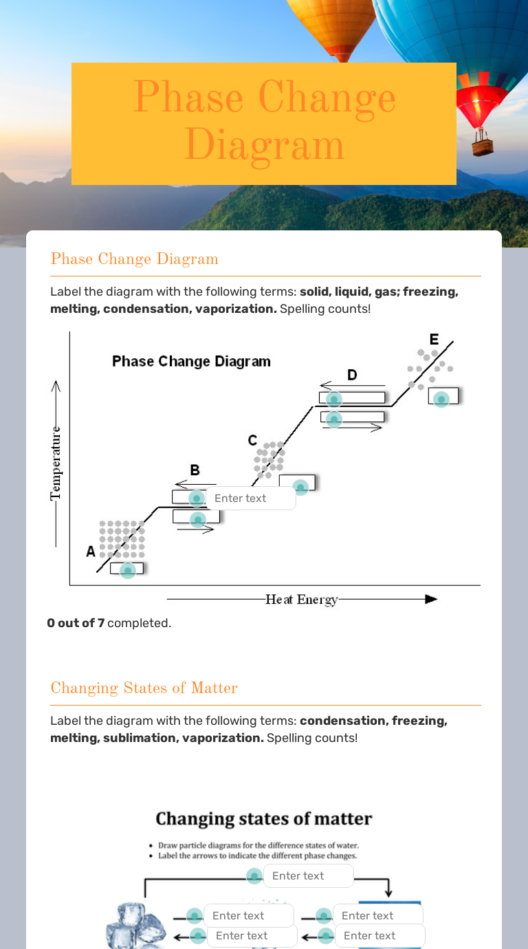 Label this on the diagram. (40.7 kJ per mol for water) Phase Change Diagram. The graph was drawn from data collected as 1 mole of a substance was heated at a constant rate. Use the graph to answer the following questions. Use the phase change diagram above to answer the following questions. Describe what is occurring from; A to B. B to C. C to ... Fill in the phase changes in the blank provided. Phase Change Worksheet. The graph was drawn from data collected as a substance was heated at a constant rate. Use the graph to answer the following questions. At point A, the beginning of observations, the substance exists in a solid state. Material in this phase has _____ volume and _____ shape. By the end of this section, you will be able to: Define phase transitions and phase transition temperatures; Explain the relation between phase transition ... Fill in the phase changes in the blank provided. Page 2. Phase Change Worksheet. The graph was drawn from data collected as a substance ...2 pages
