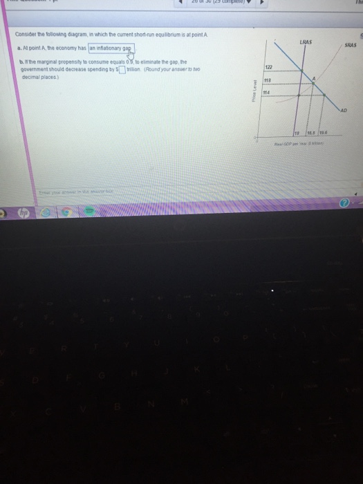 Consider the following diagram, in which the current shortrun equilibrium is at point A. a. At point A, the economy has. an inflationary gap b. If the marginal propensity to consume equals, to eliminate the gap, the government should decrease spending by $ trillion. (Round your answer to two decimal places.