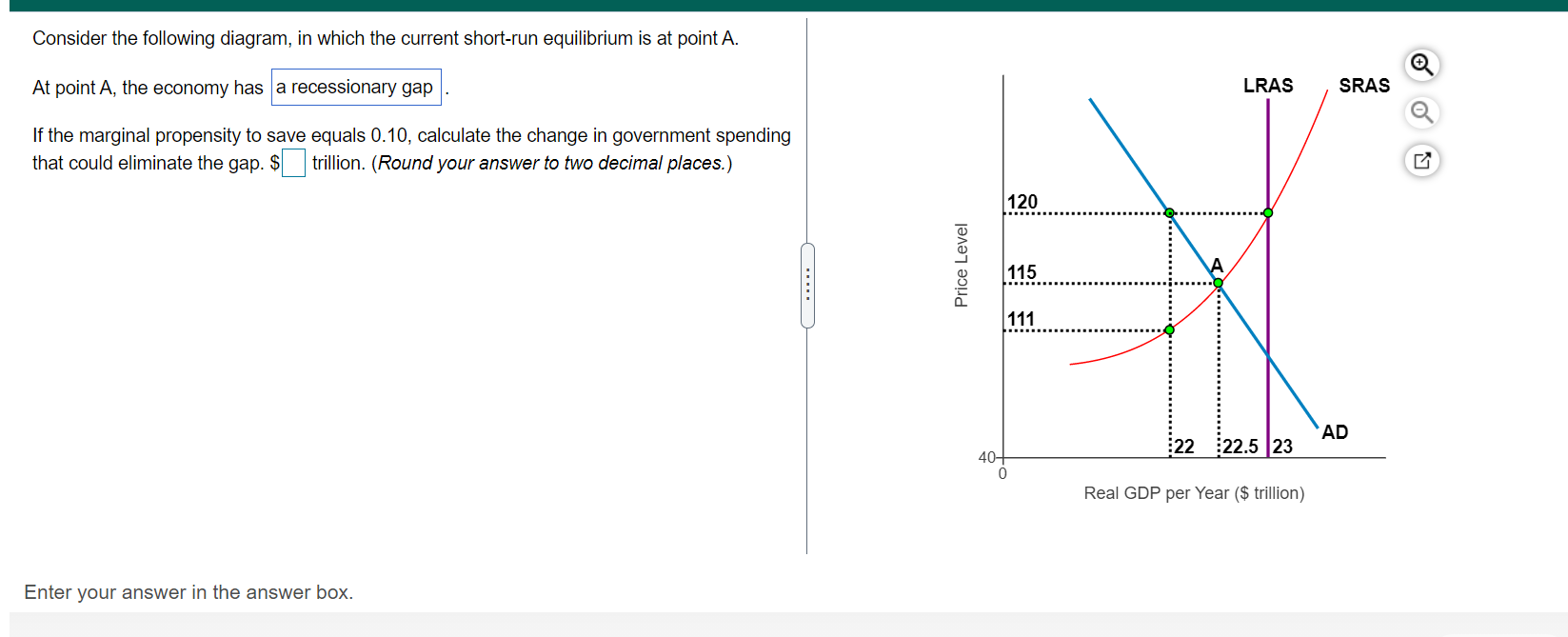 Consider the following diagram, in which the current short-run equilibrium is at point A. At point A, the economy has a recessionary gap. (This is my answer, I think it's right). If the marginal propensity to save equals 0.20, calculate the change in governemtn spending that could eliminate the gap. $ ____ trillion.