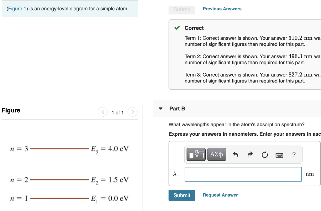 (Figure 1) is an energy-level diagram for a simple atom. What wavelengths appear in the atom's emission spectrum? Enter your answers in ascending order ...2 answers · 3 votes: Emission and absorption spectrum has same frequency (or wave length) Part A Emission spectrum ...