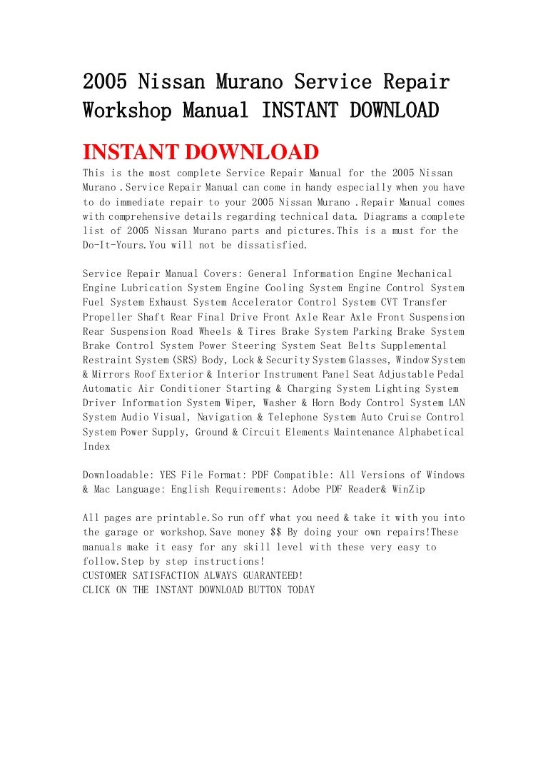 NissanPartsDeal.com offers the wholesale prices for genuine 2005 Nissan Murano parts.Parts like . Exhaust Tube & Muffler are shipped directly from authorized Nissan dealers and backed by the manufacturer's warranty.. Parts fit for the following vehicle options. Engine: 6 Cyl 3.5L. Trim: S, SE, SL.