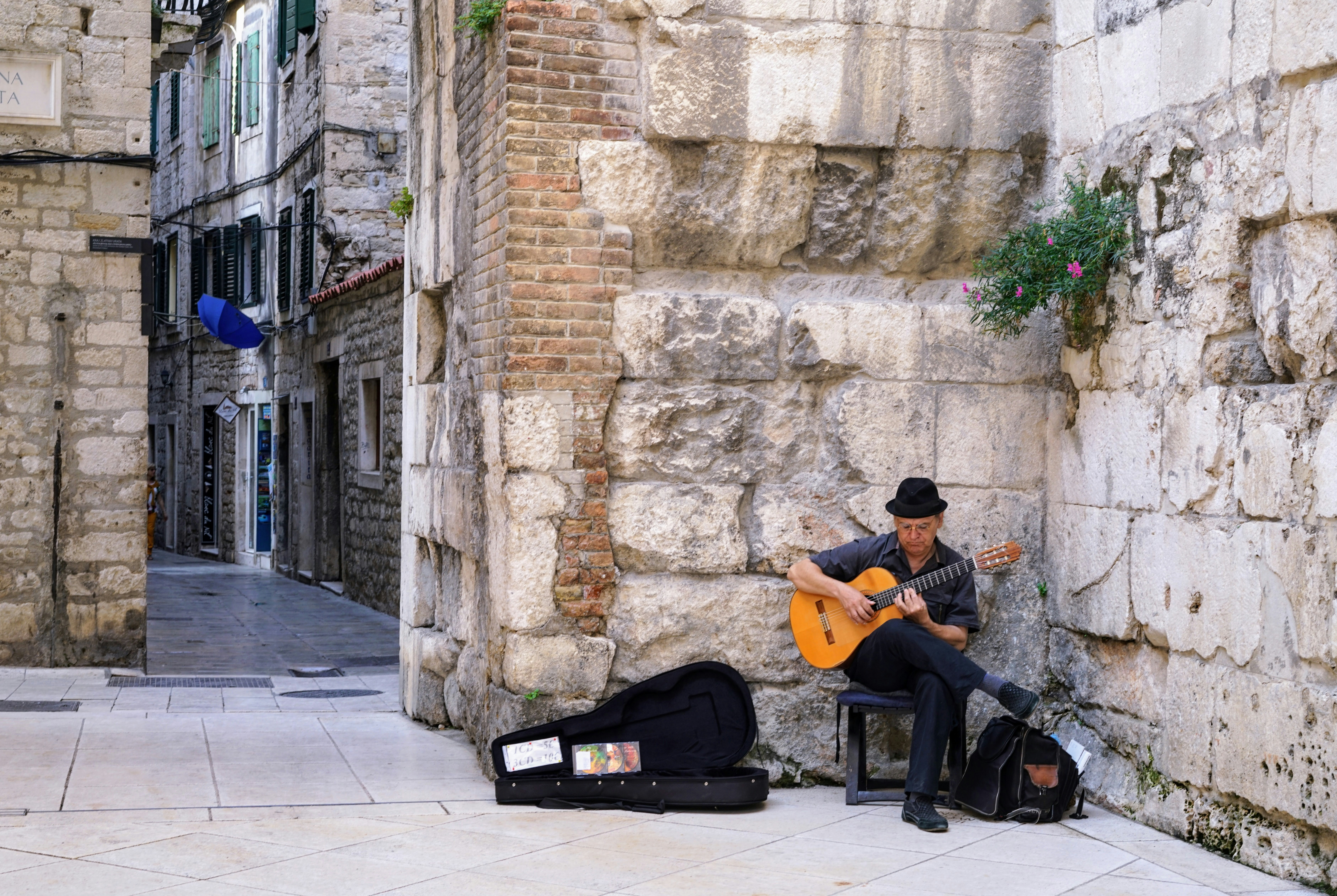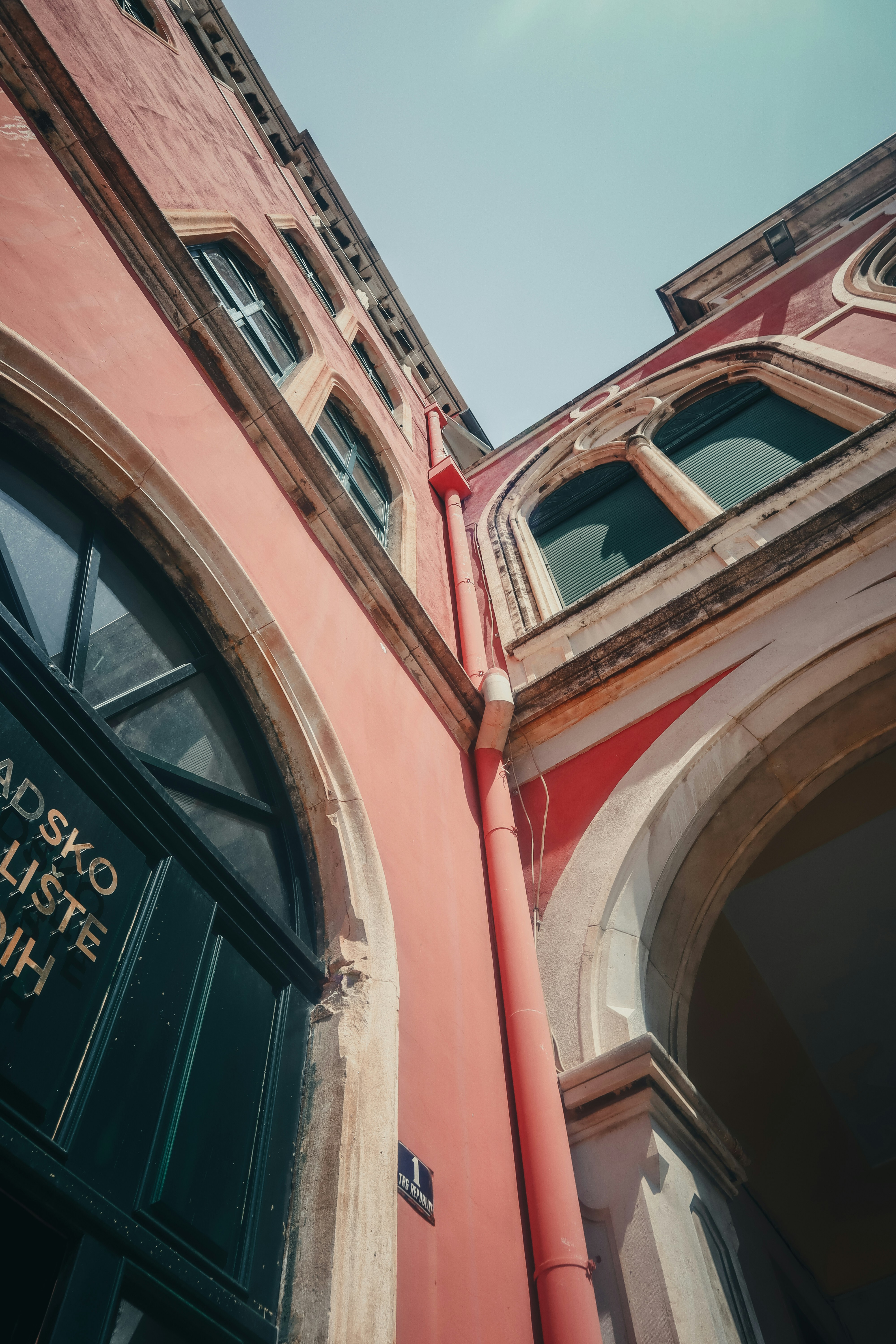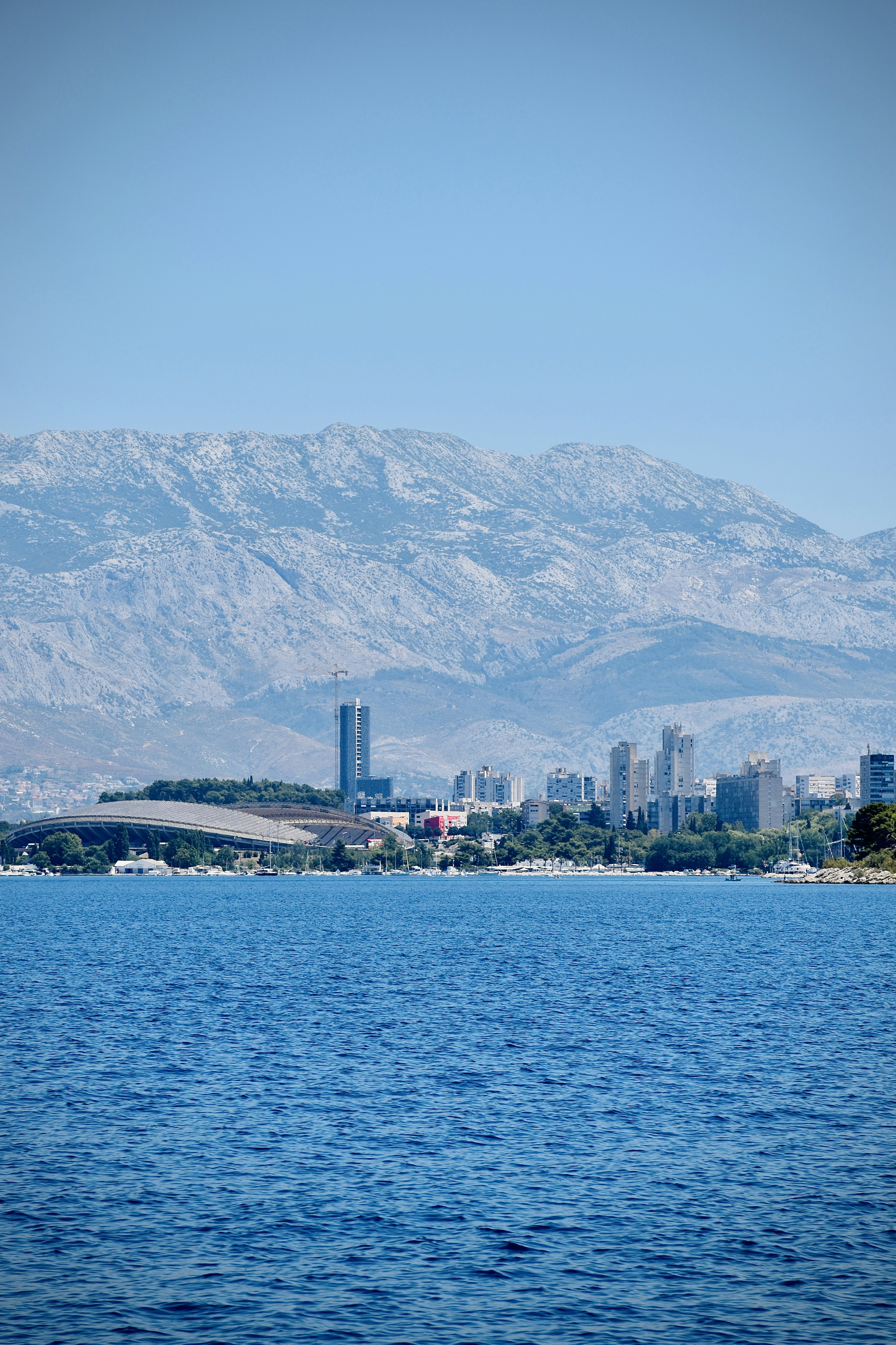 A midday July view from the Laguna to the east onto the City of Split, a very dizzling mediterranean metropolis in Dalmatia, Croatia. On the left the soccer stadium of Hajduk Split is visible with its characteristic shell shape.