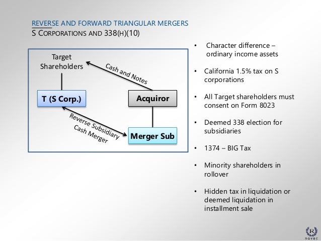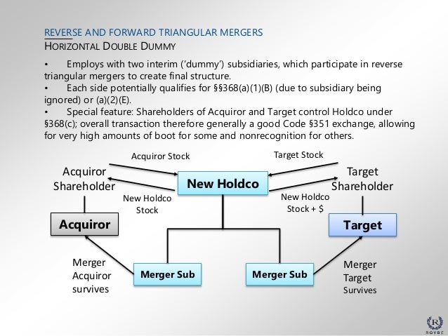 the "right" way to implement a forward triangular merger2 is sometimes to do a "two-step" transaction comprised of (1) a reverse triangular 3merger, followed immediately by (2) a "Type A" merger.4 As a practical matter, no more than 20 percent of the acquisition can be given as cash boot. Reverse Triangular Mergers Before examining the tax consequences of a reverse triangular merger, the transaction itself must be explained. Suppose P desires to acquire the stock of T in a tax-free reorganization and keep T alive as a subsidiary, but P is unable to structure the deal as a Type B reorganization because of the "solely for voting ... in a "reverse triangular merger" transaction, the target company acquires all assets and liabilities of the subsidiary of a parent company of the acquiring group, it being understood that the shareholders of said target company contribute in that context their target company's shares to the parent company, in exchange for shares of the parent … Reverse Triangular Merger ("A" Reorganization) In a reverse triangular merger, a subsidiary of the acquirer is merged into the target, leaving the target as the surviving entity and a subsidiary of the acquirer and eliminating any minority shareholders in the target. This structure allows the acquirer to shield itself from the target's ...