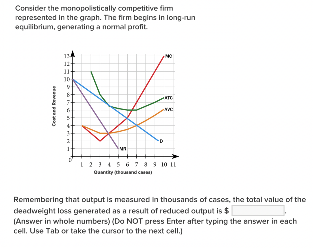 revmncmp Refer to the above diagram for a monopolistically competitive firm in short-run equilibrium. The profit-maximizing output for this firm will be: ... In long-run equilibrium the firm shown in the diagram above will: A. earn a normal profit. B. go bankrupt. C. realize a loss. D. realize an economic profit. 9. R-3 F25045. Solved 1.Refer to the diagram above. The monopolistically ... 1.Refer to the diagram above. The monopolistically competitive firm shown: a. will realize allocative efficiency at its profit-maximizing output. b. cannot operate at a loss. is in long-run equilibrium. d. is realizing an economic profit.