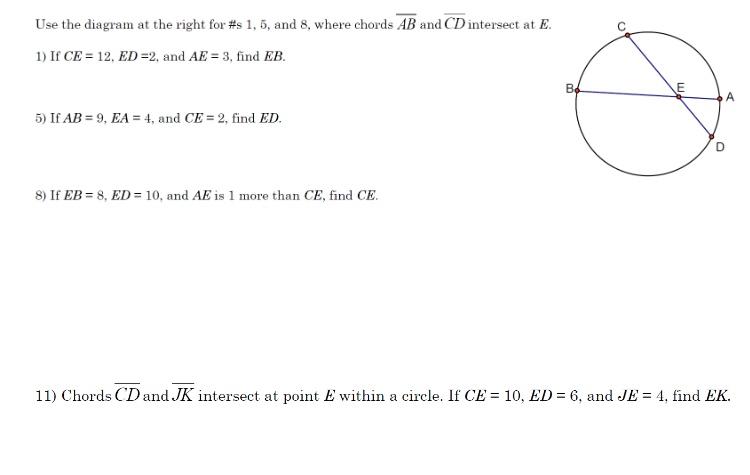 In the diagram, CE=12 units and BE=5 units. Based on the ... In the diagram, CE=12 units and BE=5 units. Based on the given information, what is AE? - 12083777 In the diagram, CE=12 units and BE=5 units. Line l is a ... In the diagram, CE=12 units and BE=5 units. Line l is a perpendicular bisector of line segment A C. It intersects line segment A C at point B. Line l also contains points D and E. Line segments A B and B C are the same length. Based on the given information, what is AE? 2 units 7 units 12 units 17 units In the diagram, ce=12 units and be-5 units. based on the ... 👍 Correct answer to the question In the diagram, ce=12 units and be-5 units. based on the given information, what is ae? 2 units 7 units 12 units 17 units - e-eduanswers.com PDF Geometry Regents Review - White Plains Public Schools Using only the information given in the diagrams, which pair of triangles can not be proven congruent? A) A B) B ... 12 C) 9 D) 6 47. In the diagram below, diameter AB bisects chord ... If AE =2 and FB =17, then the length of CE is A) 7 B) 8 C) 15 D) 16. Name: _____ ID: A 9 48. A circle with the equation (x +6)2 +(y −7)2 =64 does not include ...
