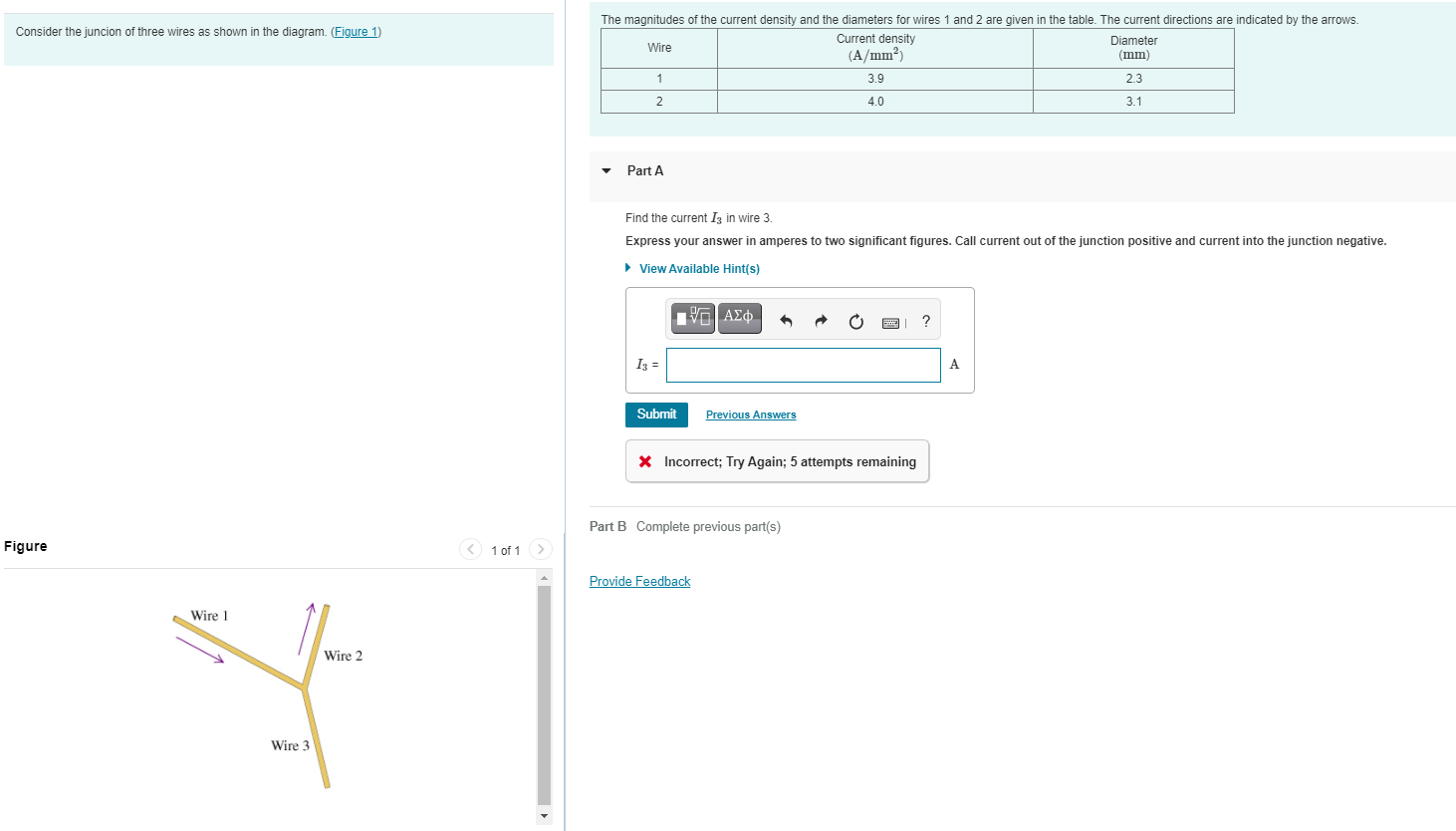 Solved Consider the juncion of three wires as shown in the ... Consider the juncion of three wires as shown in the diagram. (Figure 1) The magnitudes of the current density and the diameters for wires 1 and 2 are given in the table. The current directions are indicated by the arrows. Current density Wire Diameter (A/mm) (mm) 1 3.9 2.3 2 4.0 3.1 Part A Find the current 13 in wire 3.