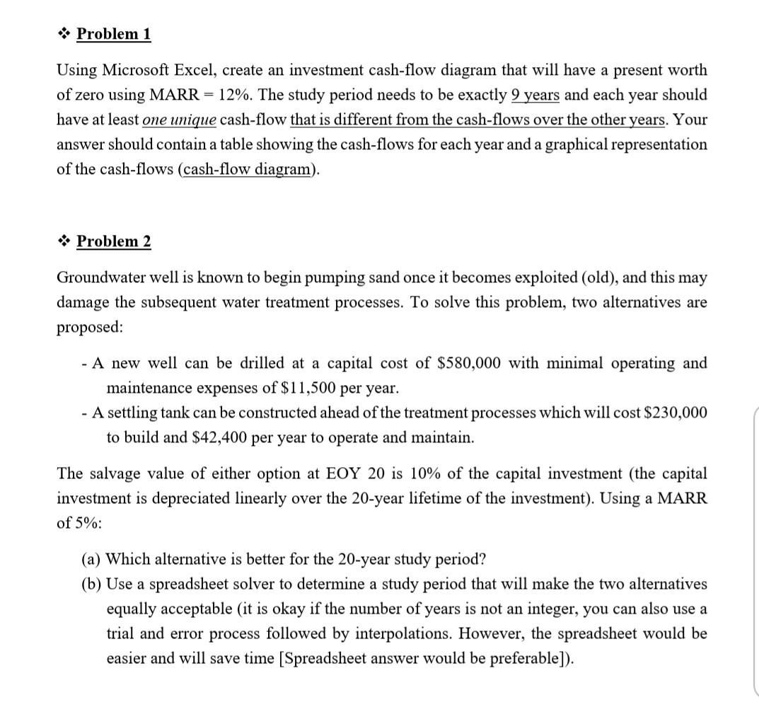 Solved Problem 1 Using Microsoft Excel, create an ... Question: Problem 1 Using Microsoft Excel, create an investment cash-flow diagram that will have a present worth of zero using MARR = 5.5%. The study period needs to be exactly & years and each year should have at least one unique cash-flow that is different from the cash-flows over the other years.