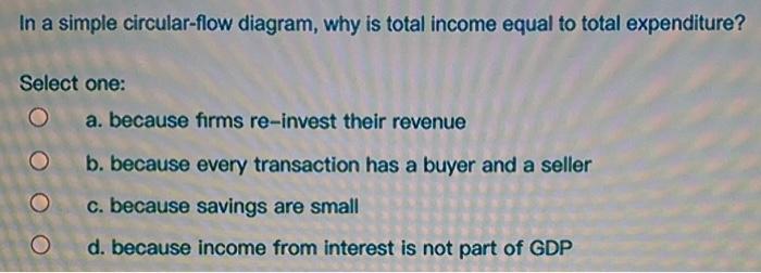In a simple circular-flow diagram that explains gdp, total income and total expenditure are
