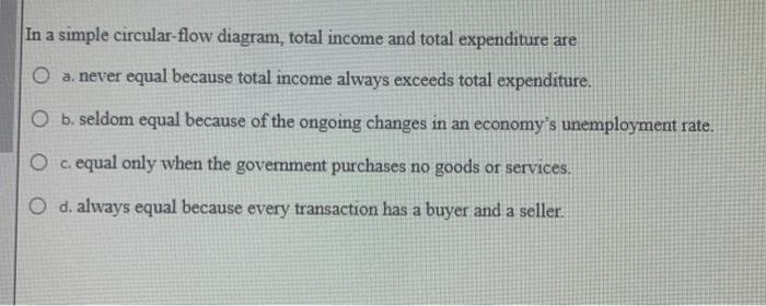 ECO 252 LN1 Chapter 10 Quiz Flashcards _ Quizlet.pdf - 2 ... 2/22/22, 5:33 PM ECO 252 LN1 Chapter 10 Quiz Flashcards | Quizlet In a simple circular-flow diagram, total income and total expenditure are a. always equal because every transaction has a buyer and a seller. b. never equal because total income always exceeds total expenditure. c. equal only when the government purchases no goods or services. d.
