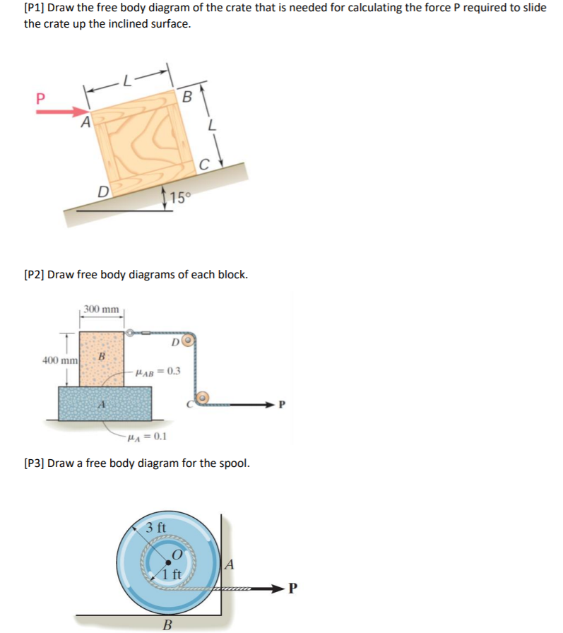 Solved Draw a free-body diagram (FBD) for each of these ... Draw a free-body diagram (FBD) for each of these problems. Solve the problems systematically, showing all steps. Keep your equations in symbolic form as long as possible; put off plugging in numbers until the very end. Answers for these problems are on the last page. 1. An external force, F, of 300 N is applied to a crate at an angle of 6 = 35 ...