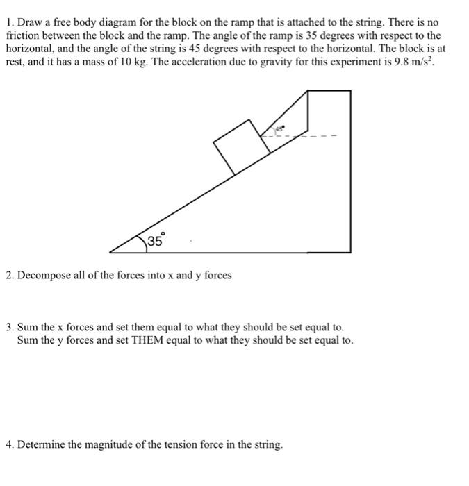Free body diagram on a ramp. Solved Draw free body diagrams of the following objects ... Draw free body diagrams of the following objects: (a) a box sliding down a 30° ramp with no friction. (b) a box at rest on a 30° ramp. (c) a box sliding down a 30° ramp with friction. (d) a box sliding up a 30o ramp with friction. You give a block of mass m a push up a frictionless ramp that makes an angle θ with the horizontal. Free-body diagram for a box on a ramp - YouTube A free-body diagram for a box on a ramp, in the special case of it being the maximum angle before the box starts to slide. The video includes an introduction... 5.7 Drawing Free-Body Diagrams | University Physics Volume 1 Free-body diagrams have been used in examples throughout this chapter. Remember that a free-body diagram must only include the external forces acting on the body of interest. Once we have drawn an accurate free-body diagram, we can apply Newton's first law if the body is in equilibrium (balanced forces; that is, F net = 0 F net = 0 ) or ... Solved Provide Chadwick now needs to push the ... - Chegg To solve this problem you should start by drawing a free-body diagram. Part D Determine the object of interest for this situation. For this. Question: Provide Chadwick now needs to push the piano up a ramp and into a moving van. (Figure 2) The piano slides up the ramp without friction. Is Chadwick strong enough to push the piano up the ramp ...