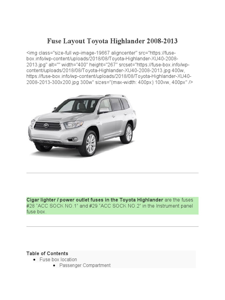 Toyota Highlander Hybrid (2008) Fuse Box Diagram |🔧 Fuses Guru Toyota Highlander Hybrid (2008) Fuse Box Diagram. In this article you will find a description of fuses and relays Toyota, with photos of block diagrams and their locations. Highlighted the cigarette lighter fuse (as the most popular thing people look for). Get tips on blown fuses, replacing a fuse, and more.