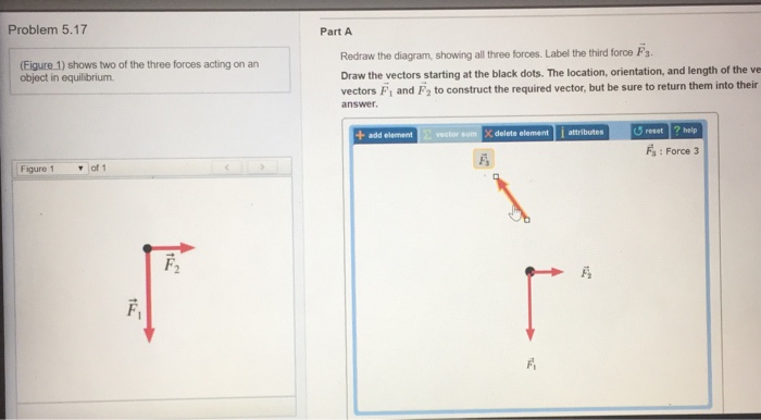 Solved (Figure 1) shows two of the three forces acting on ... Redraw the diagram, showing all three forces. Label the third force F⃗ 3. Draw the force vector starting at the black dot. The location, orientation, and length of the vector will be graded. You can move the vectors F⃗ 1 and F⃗ 2 to construct the required vector, but be sure to return them into their initial positions before submitting the answer. Solved (Figure 1) shows two of the three forces acting on ... Redraw the diagram, showing all three forces. Label the third force F⃗ 3. Draw the force vector starting at the black dot. The location, orientation, and length of the vector will be graded. You can move the vectors F⃗ 1 and F⃗ 2 to construct the required vector, but be sure to return them into their initial positions before submitting the answer. (Solved) - (Figure 1) shows two of the three forces acting ... The figure shows two forces acting on an object at rest.(Figure 1)Redraw the diagram, then add a third force that will cause the object to remain at rest. Label the new force F⃗ 3. (Remember to return all the vectors you have moved to their... Figure below shows two of the three forces acting on an ... Figure below shows two of the three forces acting on an object in equilibrium. a. Redraw the diagram, showing all three forces. Label the third force {eq}\vec F_3 {/eq}.