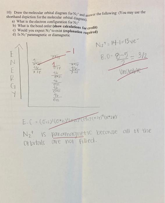 [Solved] 1. Write the molecular orbital diagram for the ... 1. Write the molecular orbital diagram for the molecular ion, N2+. Determine the number of. 2. What is the bond order in O2+? _______. 3. Draw the molecular orbital diagram for B2. The number of unpaired electrons in the.